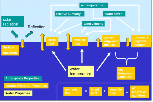 - Remark: latent heat and sensible heat depend on water temperature so they should be computed by the model. Net long wave radiation is a balance between downward long wave radiation (emission from the atmosphere) and upward long wave radiation (emission from water) and should be computed by the model.