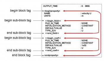 Each block of information is delimited by a begin block tag and an end block tag, each written in a different line. The begin block and end block tags are normally written between the following symbols < and > (e.g. <beginproperty> and “<endproperty>”).